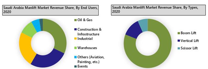 In terms of types, the segments boom and vertical lift cumulatively have captured 93% of the market revenues in 2020, with boom lift leading the market. The segment boom lifts generated majority of the market revenues owing to its application in construction and oil & gas sector due to its higher operational height and higher weight carrying capacity. Further, various projects such as Saudi Aramco and Saudi Basic Industries Corp (SABIC) joint oil-to-chemicals project in the Red City of Yanbu, involving the construction of a full oil refinery, would further increase the demand for boom lifts in Saudi Arabia in the forthcoming years.